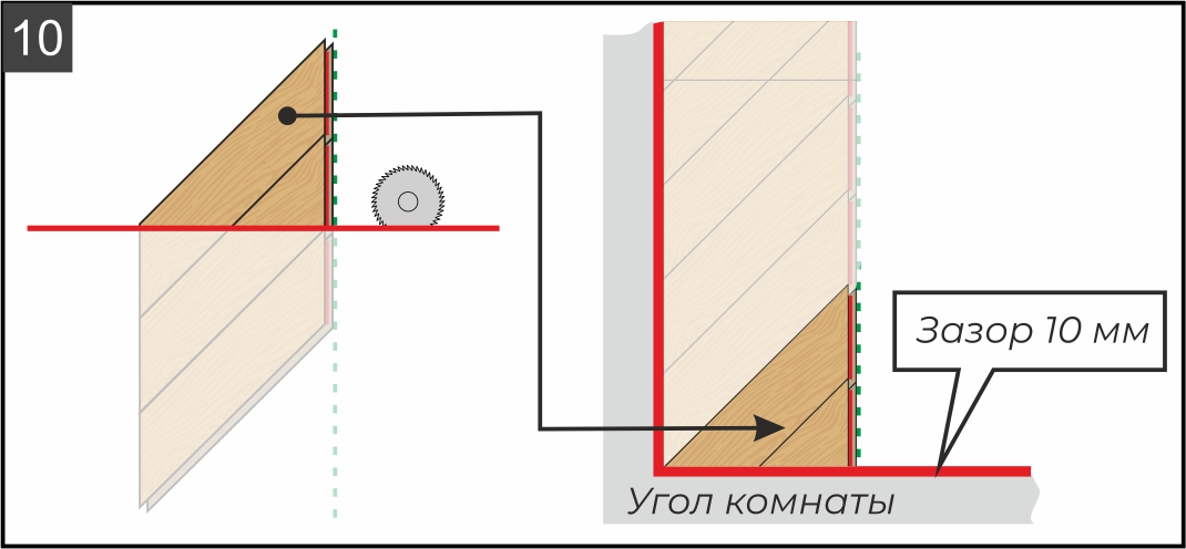 9.2. Отрежьте край ряда по указанной на рисунке красной линии (она формируется в зависимости от левого угла комнаты). Исходя из расчетов (см. рисунок 5) при необходимости подрежьте плашки по длине. В зависимости от типа пилы, которую вы используете, разберите плашки и отпилите каждую по отдельности или сделайте это уже в сборке, предварительно наметив линию при помощи угольника и карандаша.
