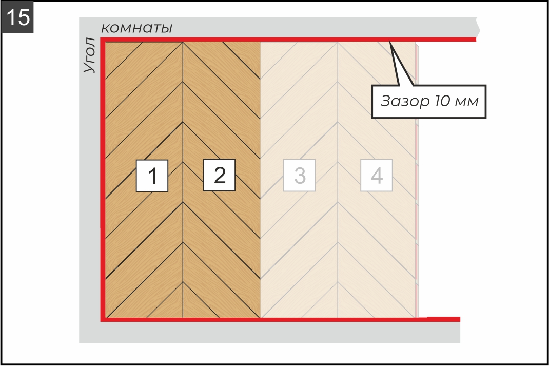 11.1. Основные этапы монтажа идентичны этапам укладки плавающим способом (начиная с раздела 8 «Разметочные работы»).
