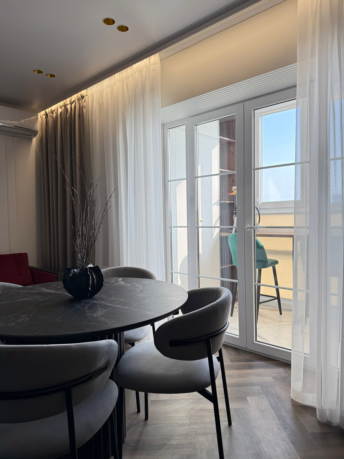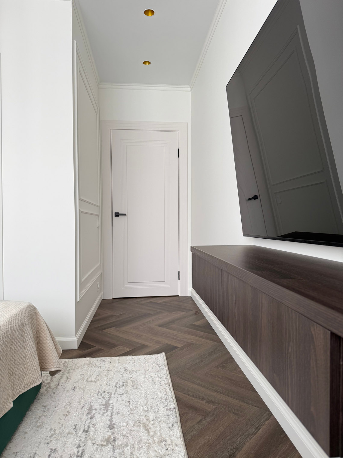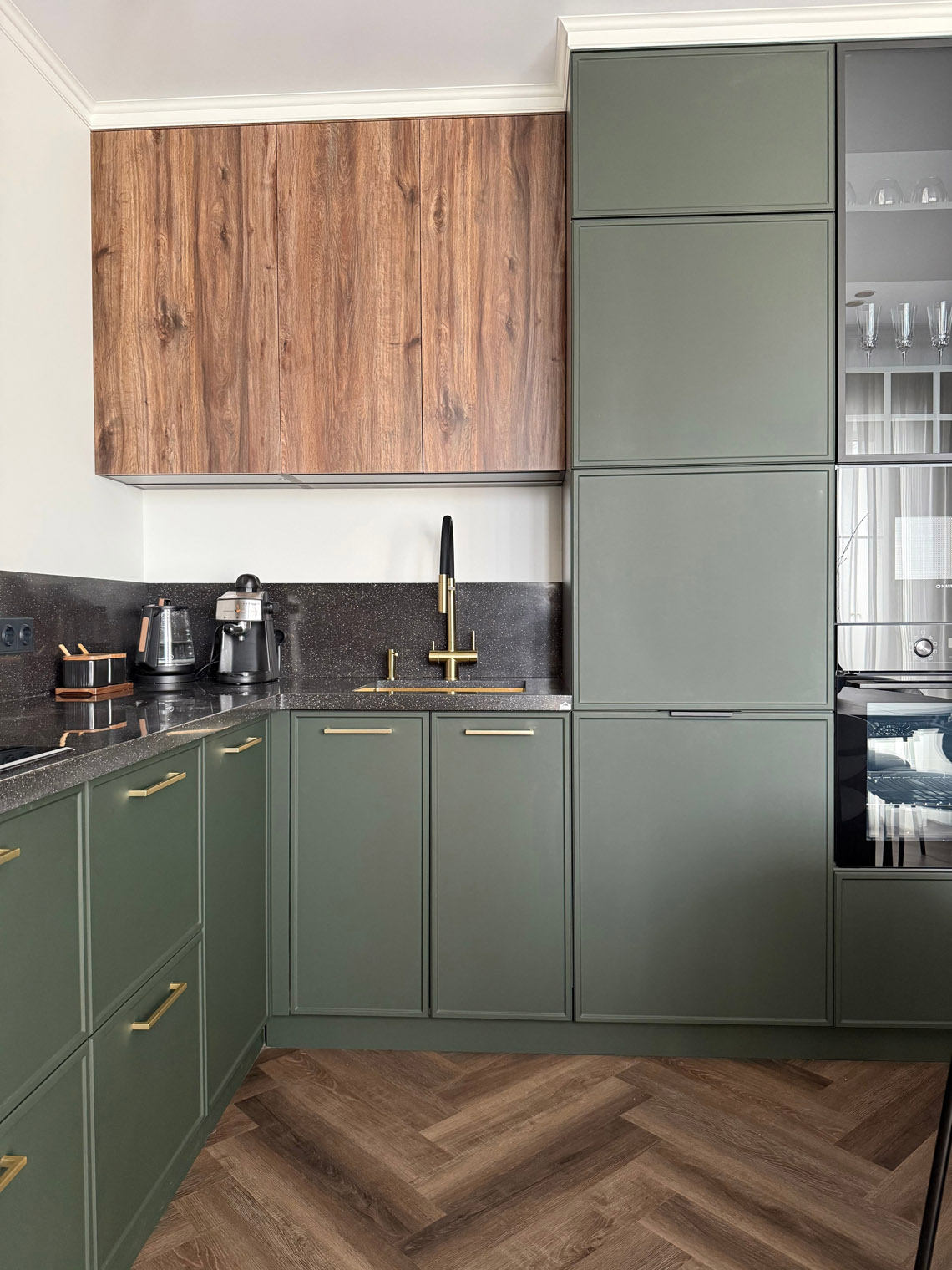 В основе этого интерьера — смелый контраст: белоснежные стены + темная мебель. То, чего многие избегают, здесь выглядит безупречно. Кварцевый ламинат в укладке мелкой «ёлочкой» добавил пространству графичности и поддержал насыщенную цветовую палитру.
